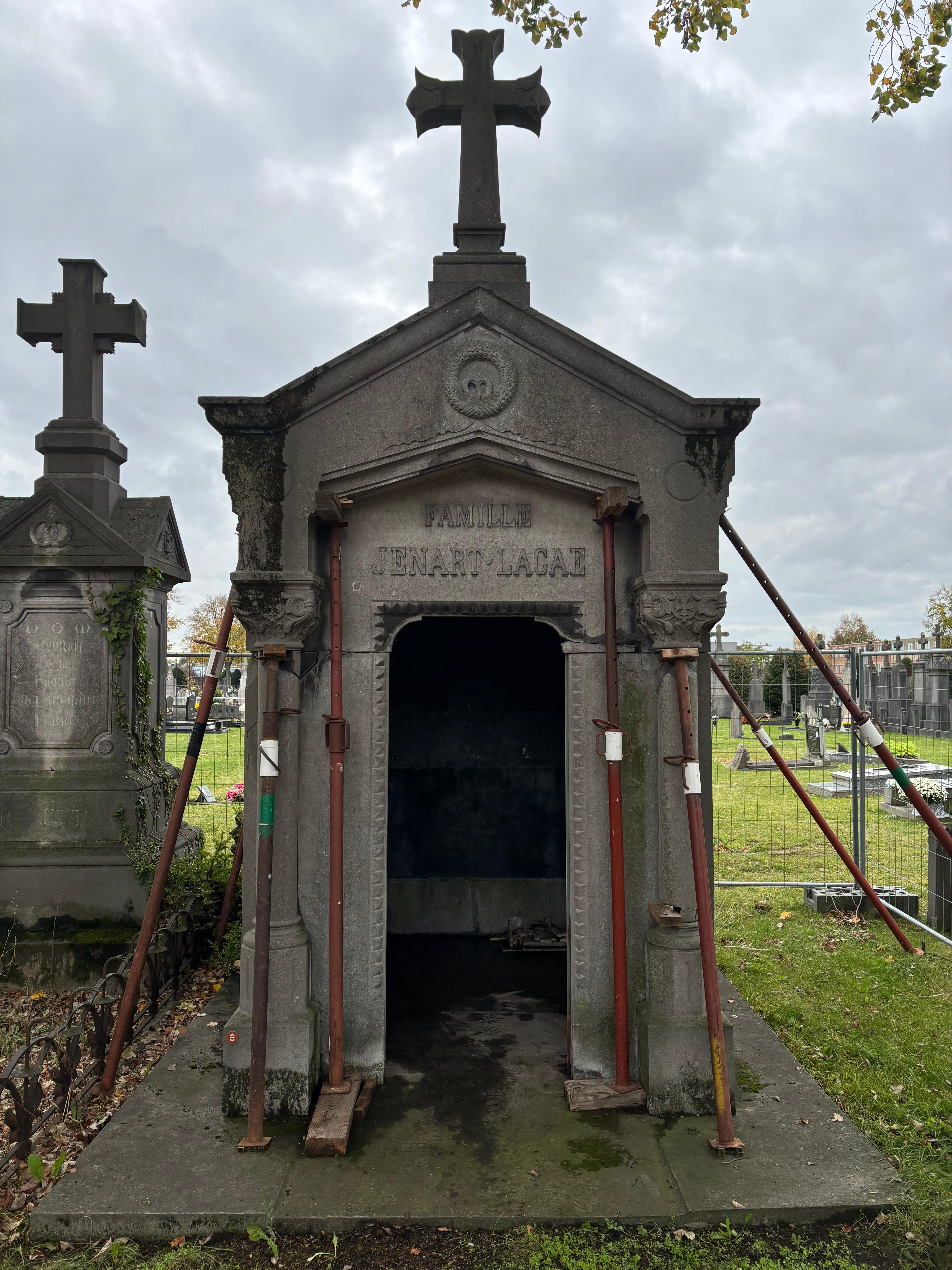De grafkapel die hiervoor het startpunt vormt, is deze van de belangrijke Heulse familie Jenart – Lagae op de Sint-Jansbegraafplaats. Deze familie speelde een belangrijke rol in de industriële geschiedenis van onze regio, onder meer in de productie van lijnzaad en lijnolie uit vlas. Ook de vroegere Heulse burgemeester August Lagae was een telg van deze bekende familie.