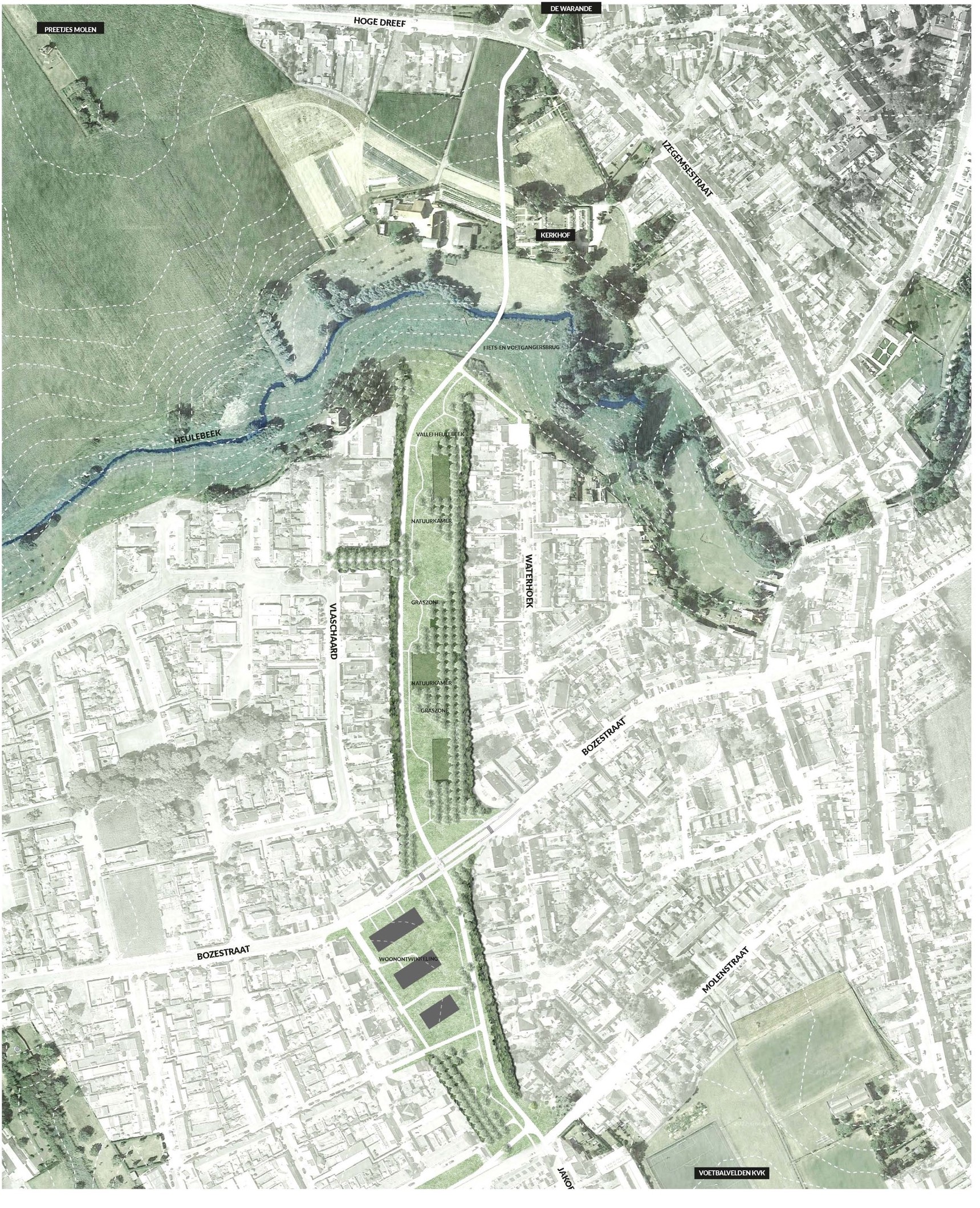 De akkers tussen Molenstraat – Bozestraat en Heulebeek werden aangekocht door de stad. Oorspronkelijk dienden ze als reservatiestrook N50c voor gemotoriseerd verkeer (= verbindingsweg tussen de binnenring R36 en buitenring R8). Maar inmiddels kregen deze gronden een nieuwe bestemming aan de hand van een ruimtelijk uitvoeringsplan (= RUP).